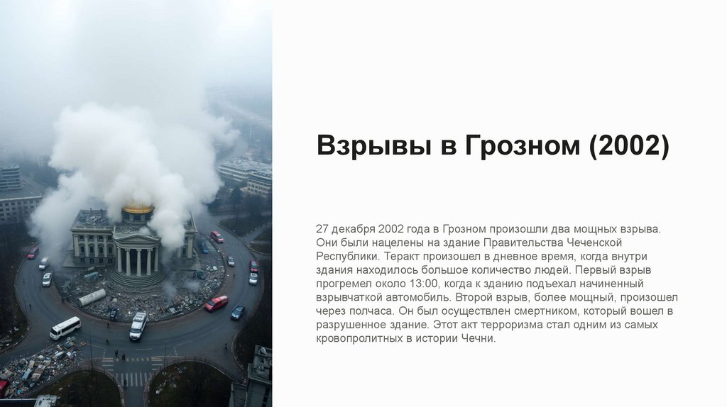 Взрывы в Грозном (2002)27 декабря 2002 года в Грозном произошли два мощных взрыва.