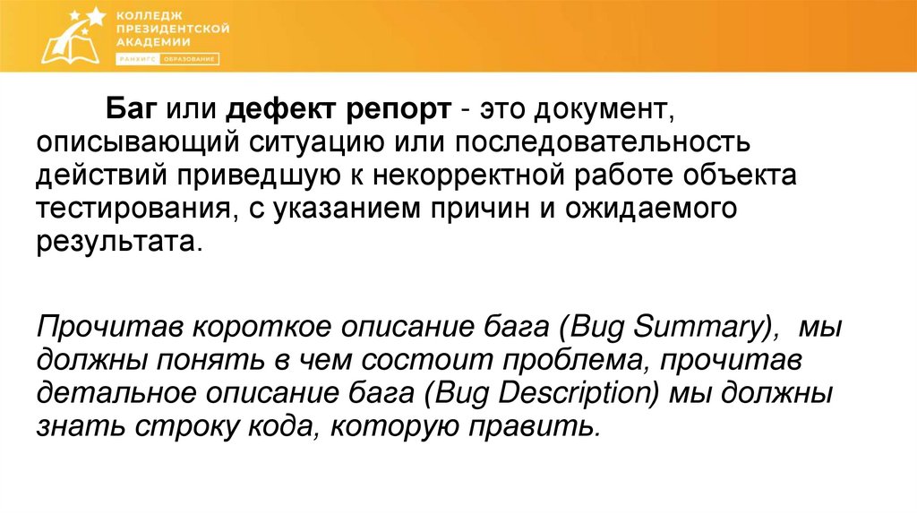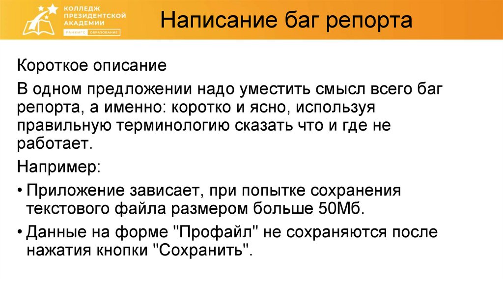 • Баг репорт - это технический документ и в связи языкописания проблемы должен быть техническим. Должна