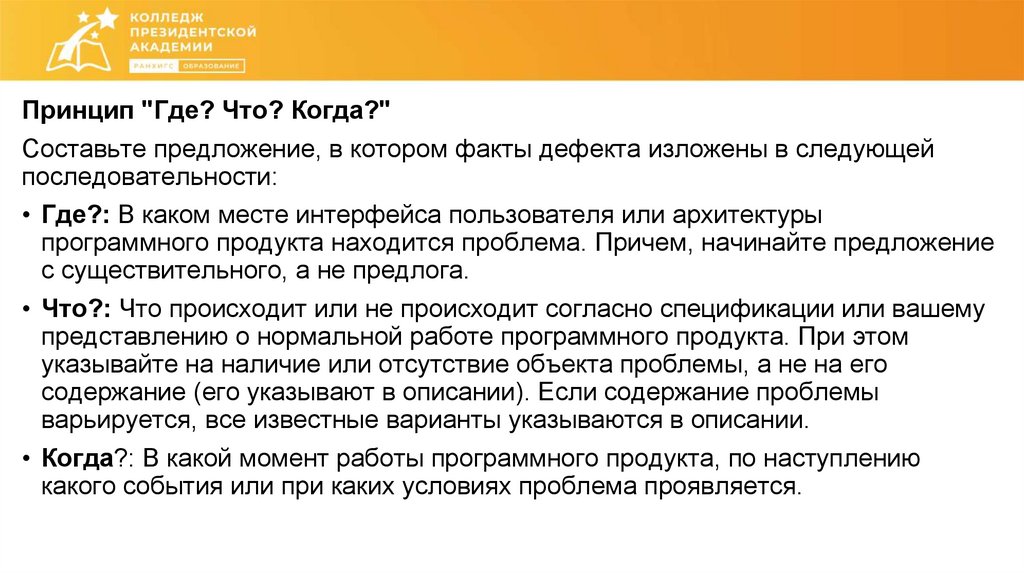Принцип "Где? Что? Когда?"Составьте предложение, в котором факты дефекта изложены в следующей