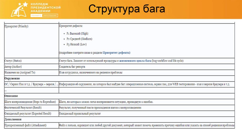 Заполнение полей баг репортаВ описанной ниже таблице представлены основные поля баг репорта и роль работника,