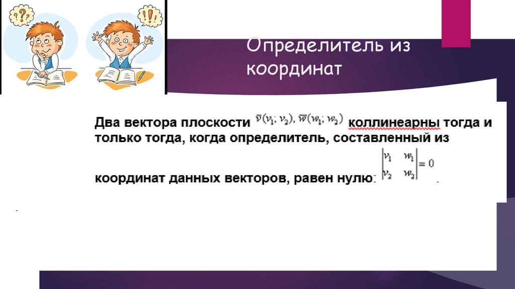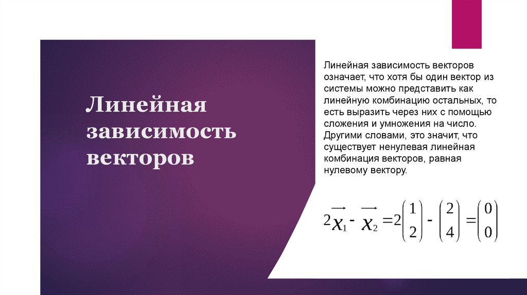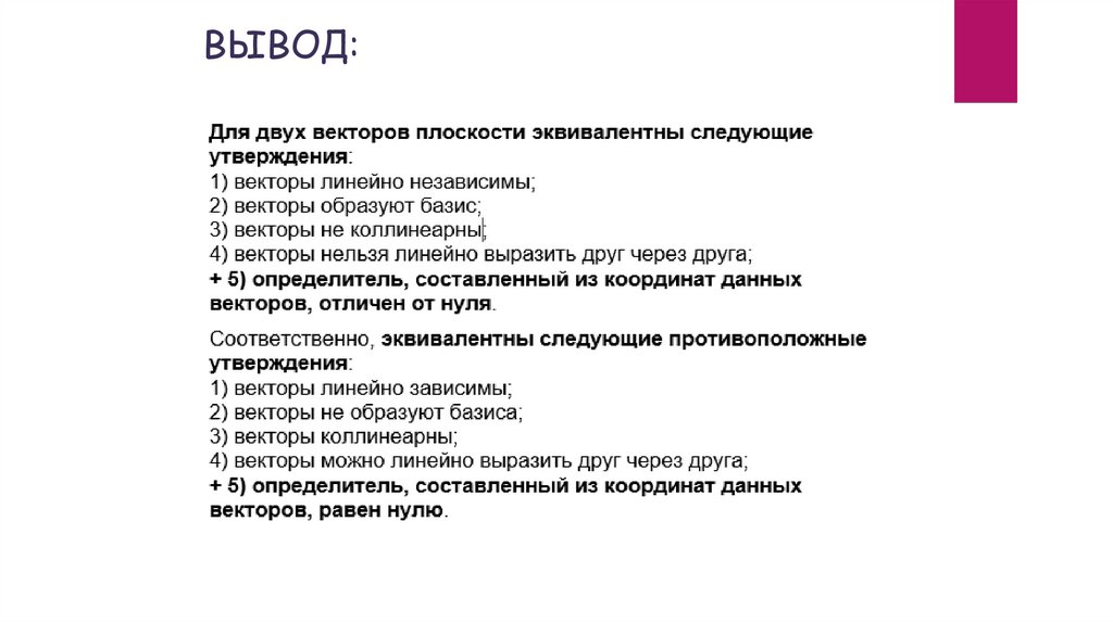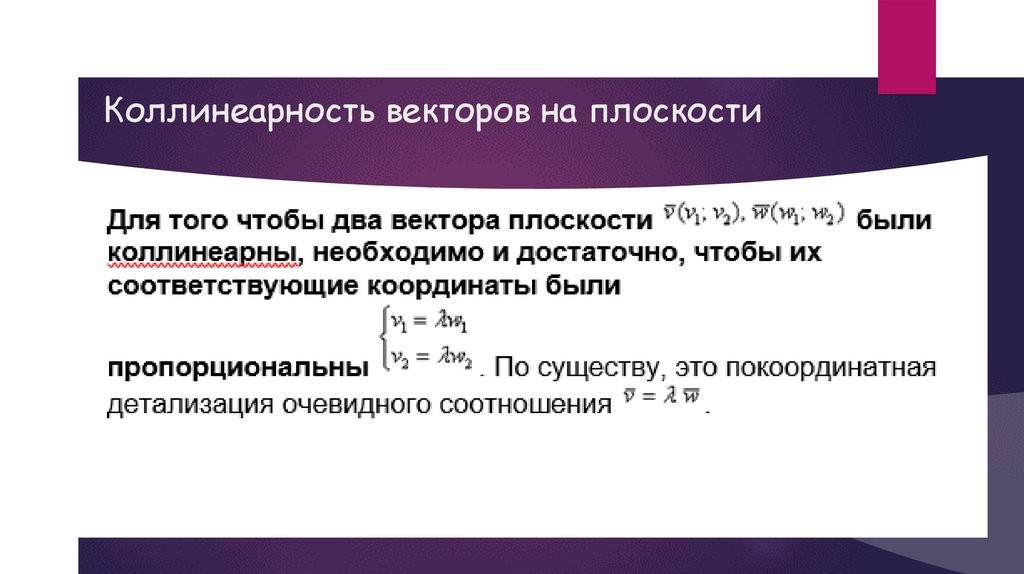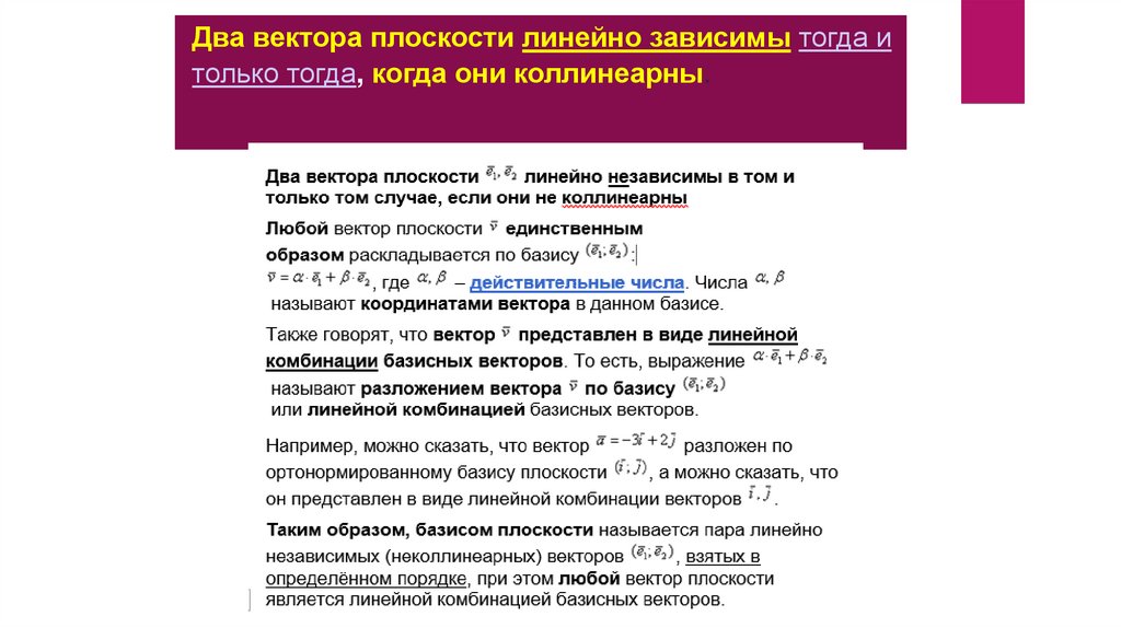 Два вектора плоскости линейно зависимы тогда итолько тогда, когда они коллинеарны.