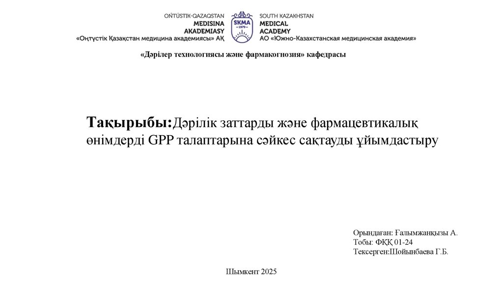 «Дәрілер технологиясы және фармакогнозия» кафедрасыТақырыбы:Дәрілік заттарды және фармацевтикалық