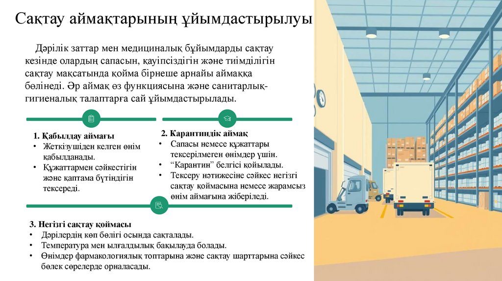 Сақтау аймақтарының ұйымдастырылуыДәрілік заттар мен медициналық бұйымдарды сақтау