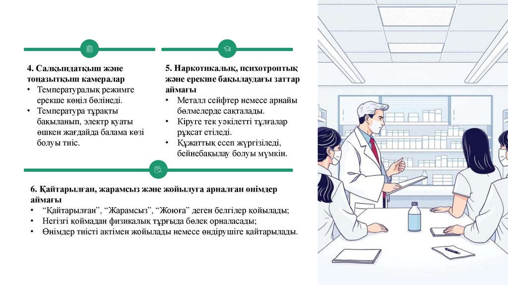 • Дәрілік заттарды дұрыс қабылдау, сақтау және босату;