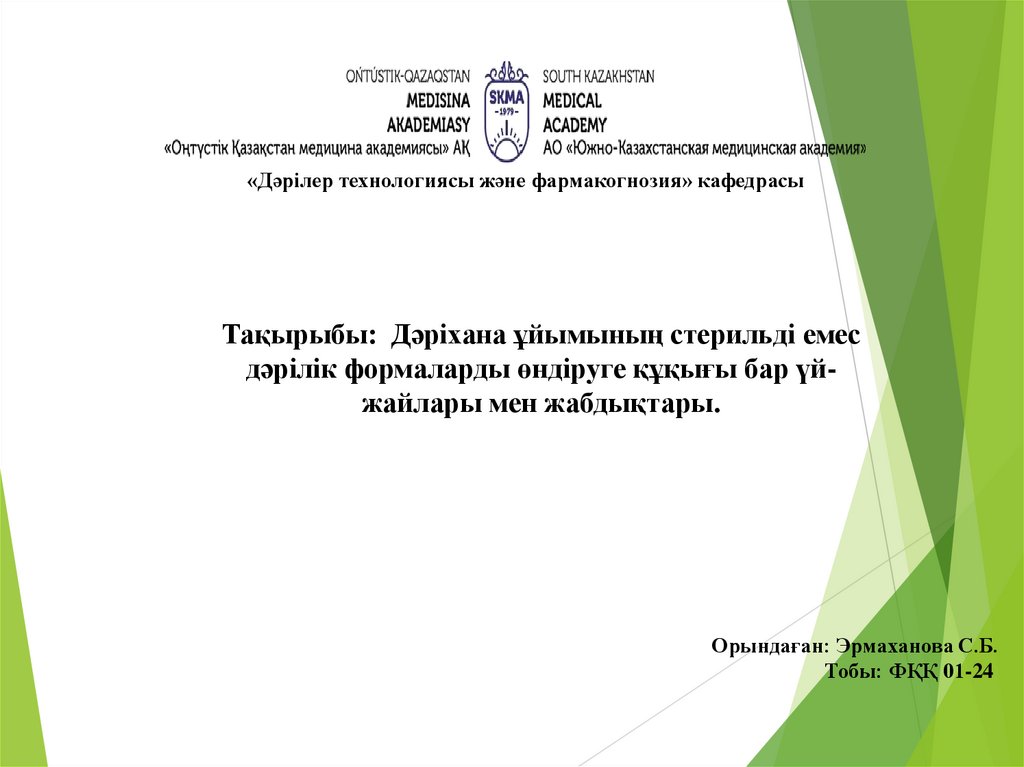 «Дәрілер технологиясы және фармакогнозия» кафедрасыТақырыбы: Дәріхана ұйымының стерильді емес