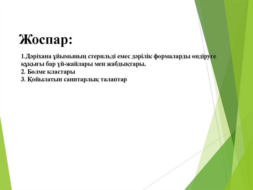 Жоспар:1.Дәріхана ұйымының стерильді емес дәрілік формаларды өндіруге
