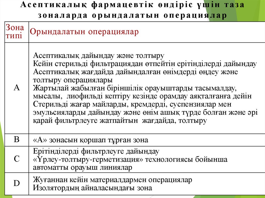 Ас е п т и к а л ы қ ф а р м а ц е вт і к ө н д і р і с ү ш і н т а з аз о н а л а р д а о р ы н д а л ат ы н о п е р а ц и я л а р