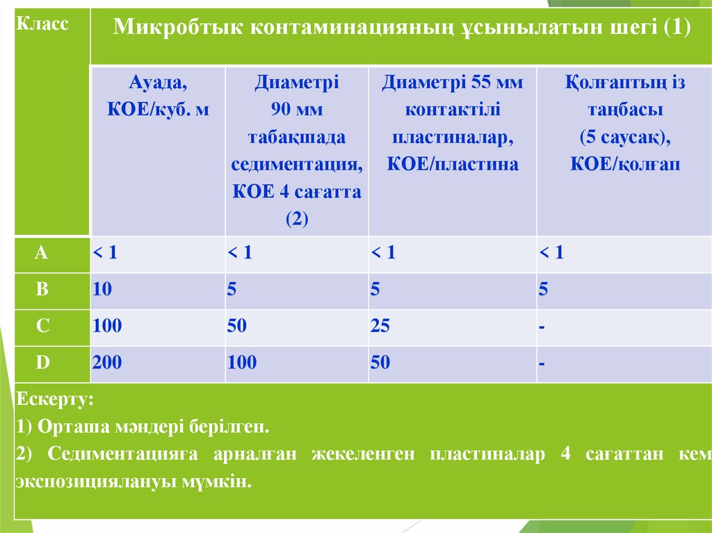 КлассМикробтык контаминацияның ұсынылатын шегі (1)