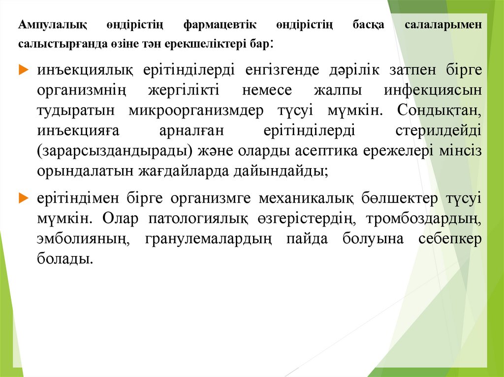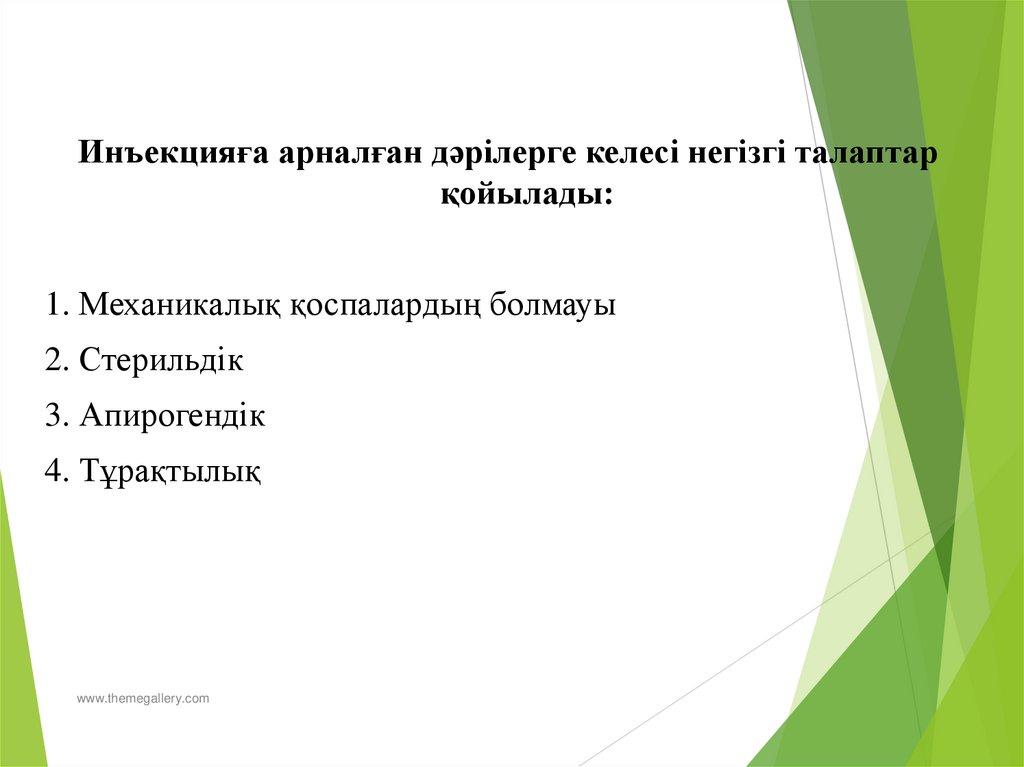 Инъекцияға арналған дәрілерге келесі негізгі талаптарқойылады: