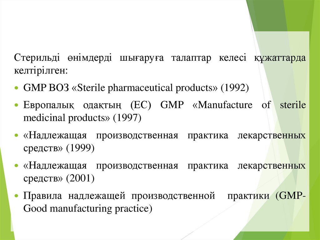 Стерильді өнімдерді шығаруға талаптар келесі құжаттардакелтірілген: