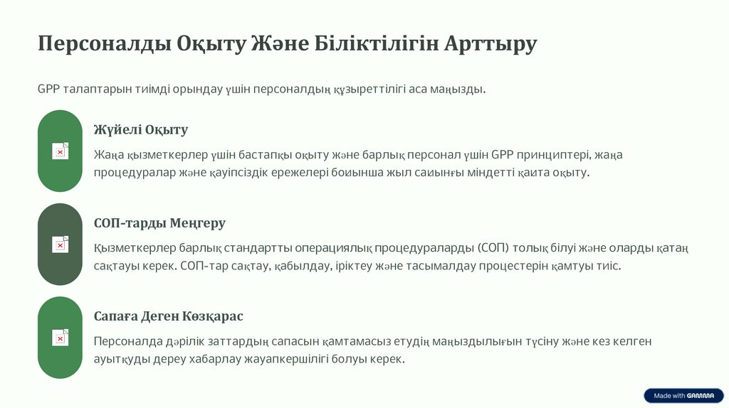 Персоналды Оқыту Және Біліктілігін АрттыруGPP талаптарын тиімді орындау үшін персоналдың құзыреттілігі аса маңызды.