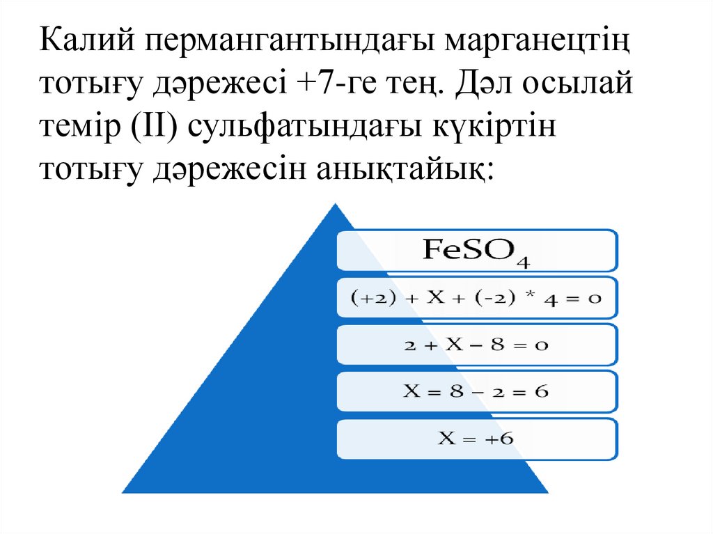 Калий пермангантындағы марганецтіңтотығу дәрежесі +7-ге тең. Дәл осылай