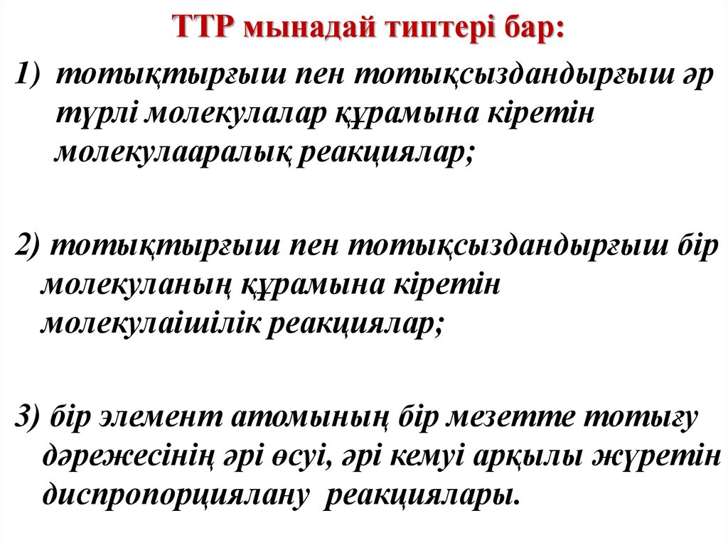 ТТР мынадай типтері бар:1) тотықтырғыш пен тотықсыздандырғыш әр