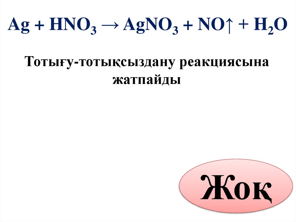 Ag + HNO3 → AgNO3 + NO↑ + H2OТотығу-тотықсыздану реакциясына