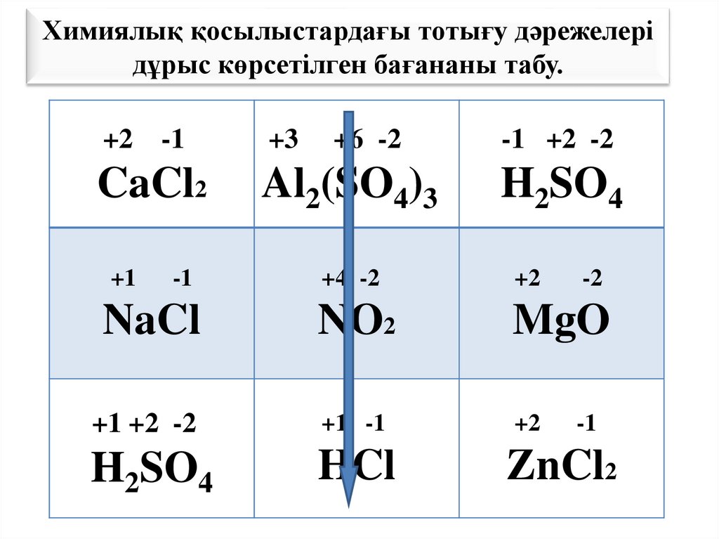 Химиялық қосылыстардағы тотығу дәрежелерідұрыс көрсетілген бағананы табу.