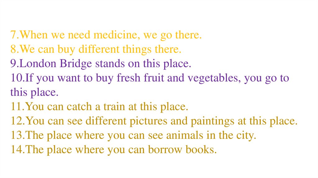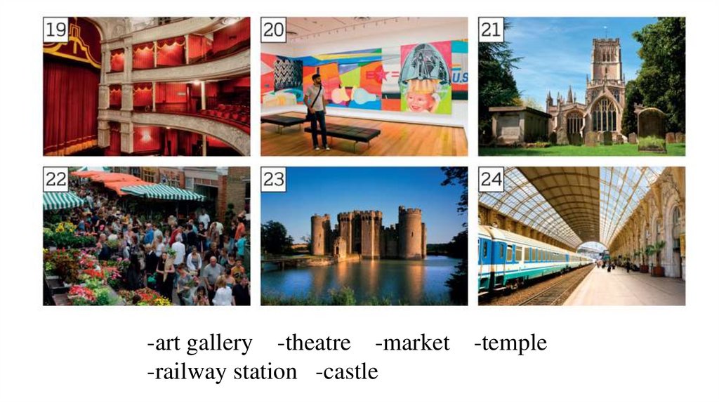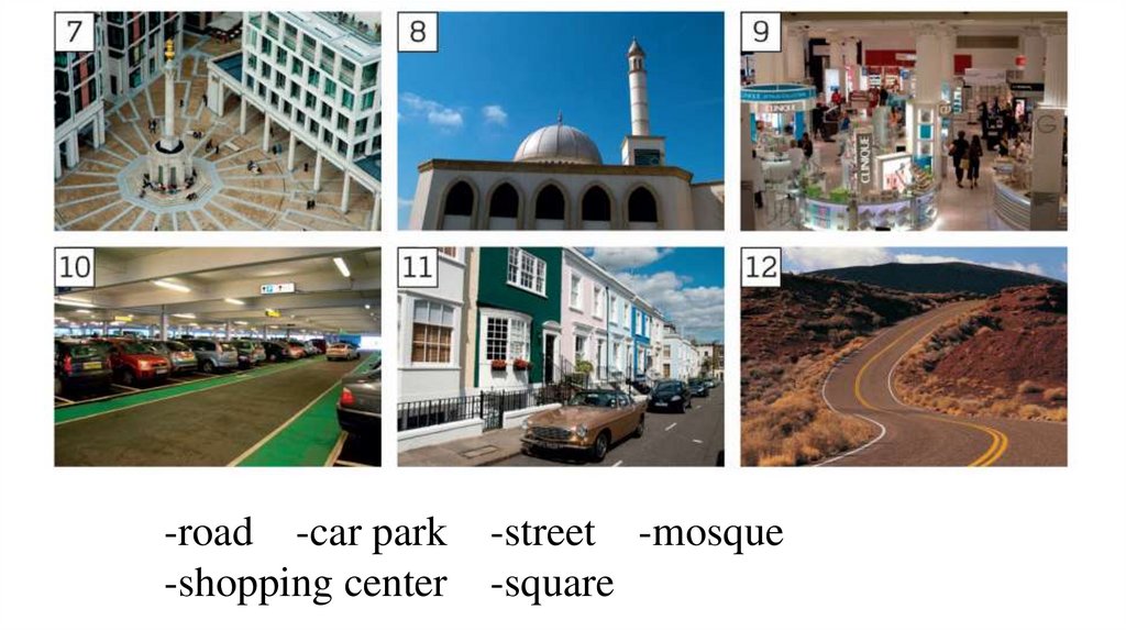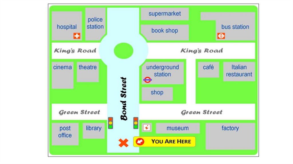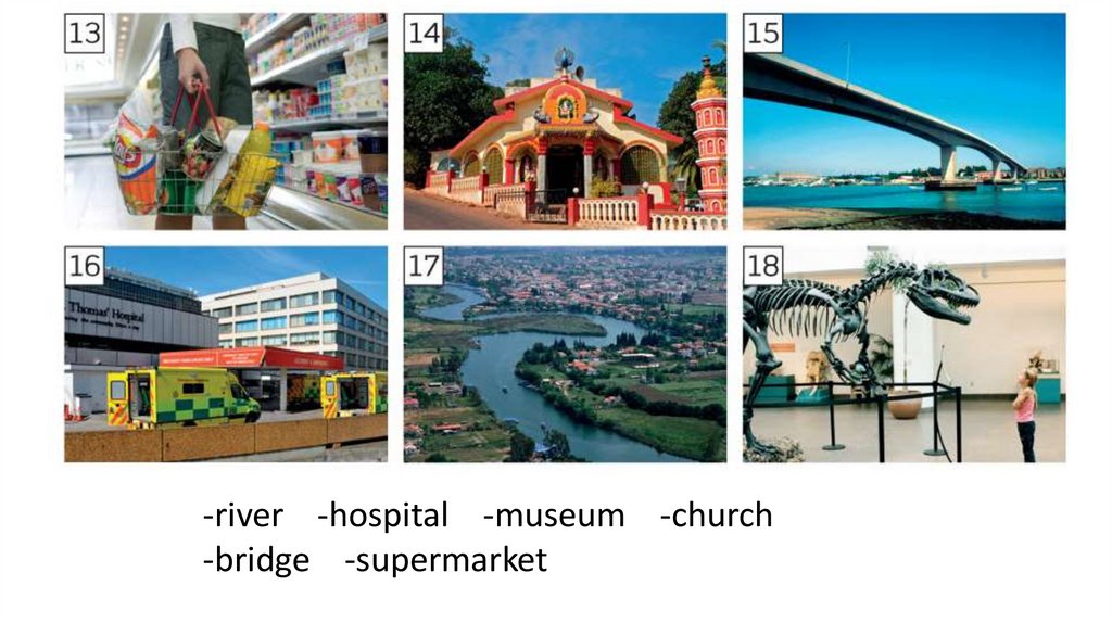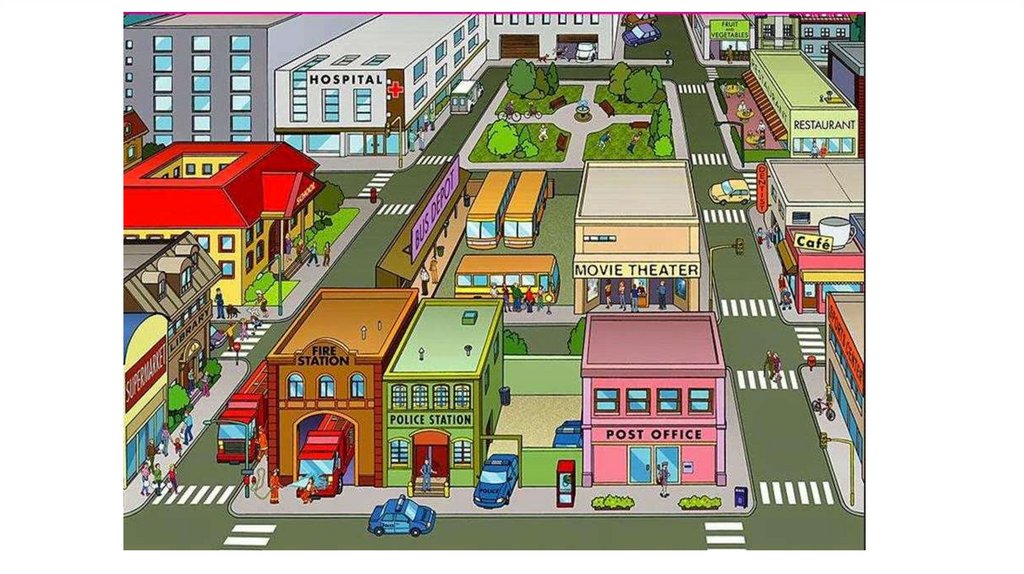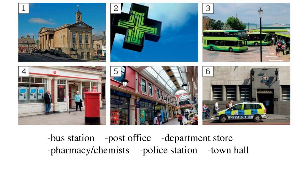 -bus station -post office -department store-pharmacy/chemists -police station -town hall