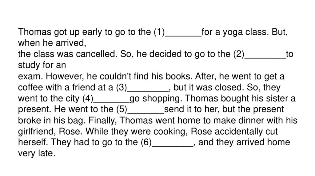 Thomas got up early to go to the (1)________for a yoga class. But,when he arrived,