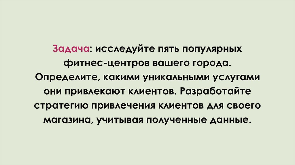 Задача: исследуйте пять популярныхфитнес-центров вашего города.