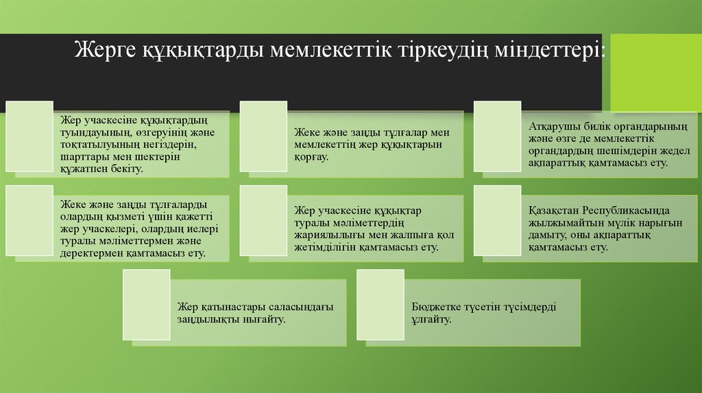 Жерге құқықтарды мемлекеттік тіркеудің міндеттері:Жер учаскесіне құқықтардың