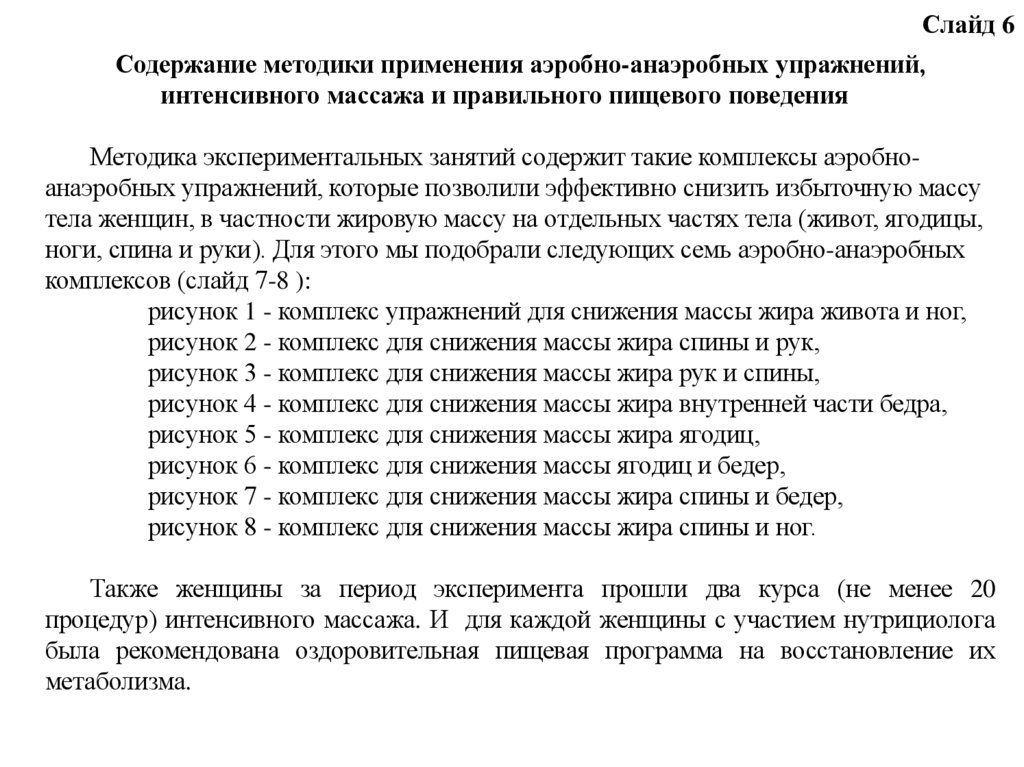комплексной методики включающей в себя аэробноанаэробные упражнения, курс интенсивного массажа