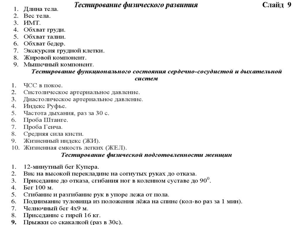 6. Проба Штанге, 7. Проба Генча, 8. Средняя сила кисти, 9. Жизненный индекс (ЖИ), 10. Жизненная