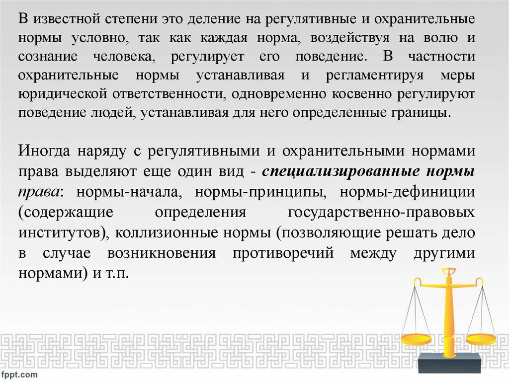 В известной степени это деление на регулятивные и охранительныенормы условно, так как каждая норма, воздействуя на волю и