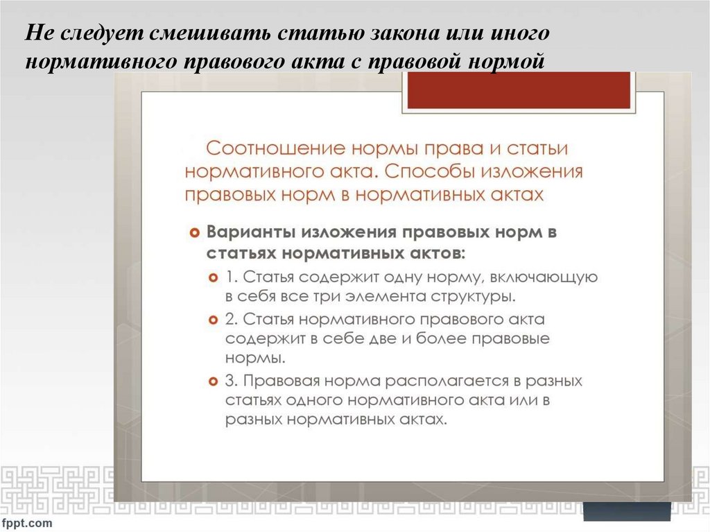Не следует смешивать статью закона или иногонормативного правового акта с правовой нормой