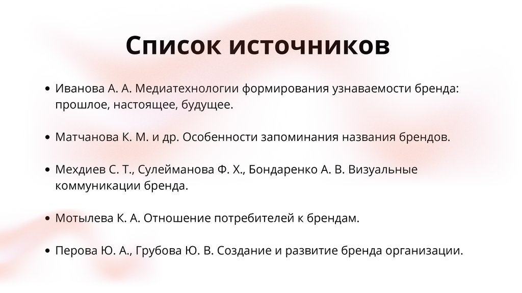 Список источниковИванова А. А. Медиатехнологии формирования узнаваемости бренда:
