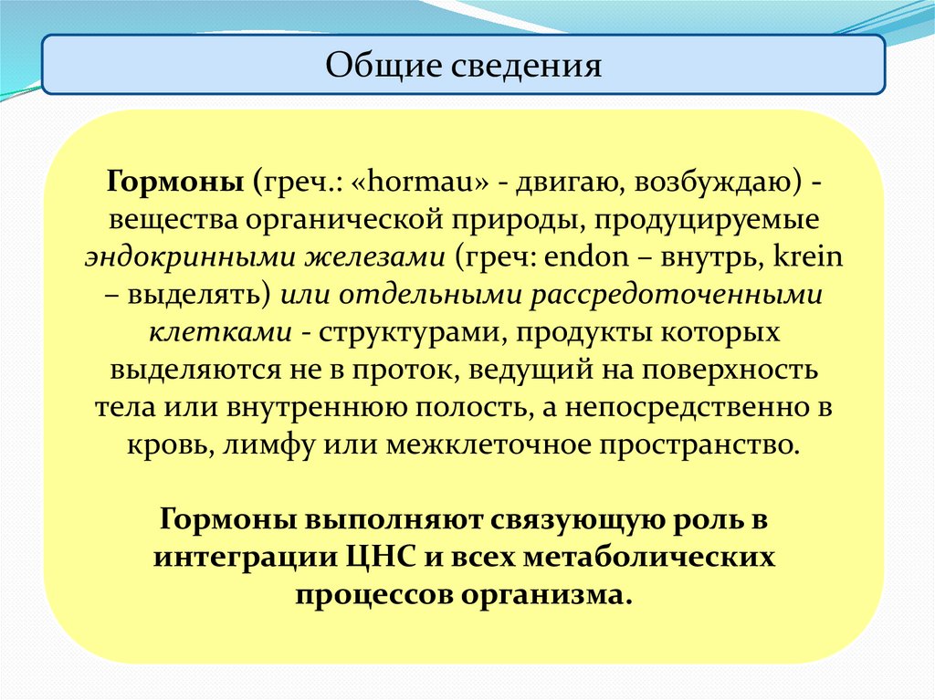 Общие сведенияГормоны (греч.: «hormau» - двигаю, возбуждаю) вещества органической природы, продуцируемые