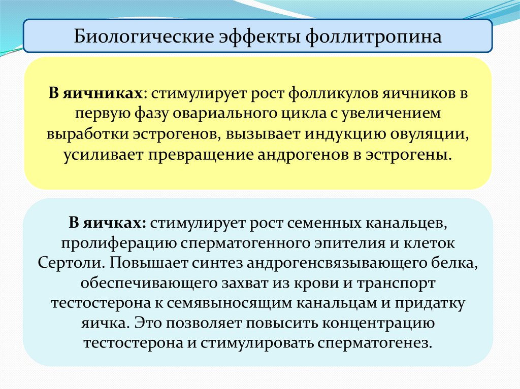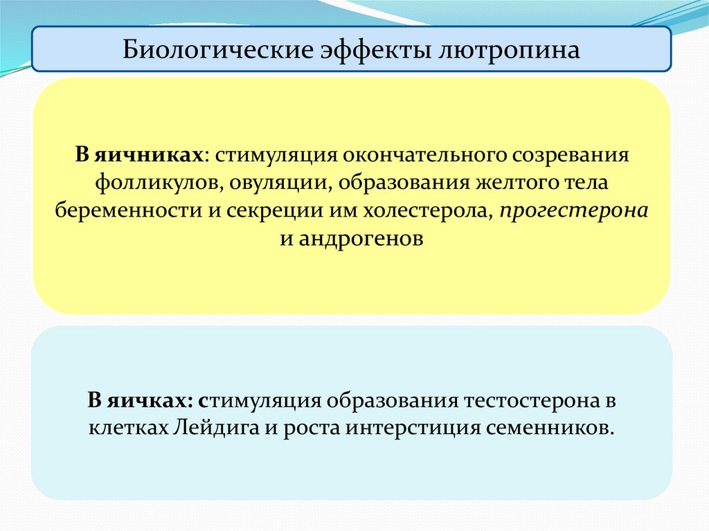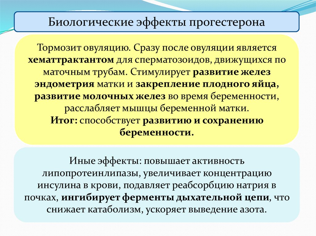 Биологические эффекты прогестеронаТормозит овуляцию. Сразу после овуляции является