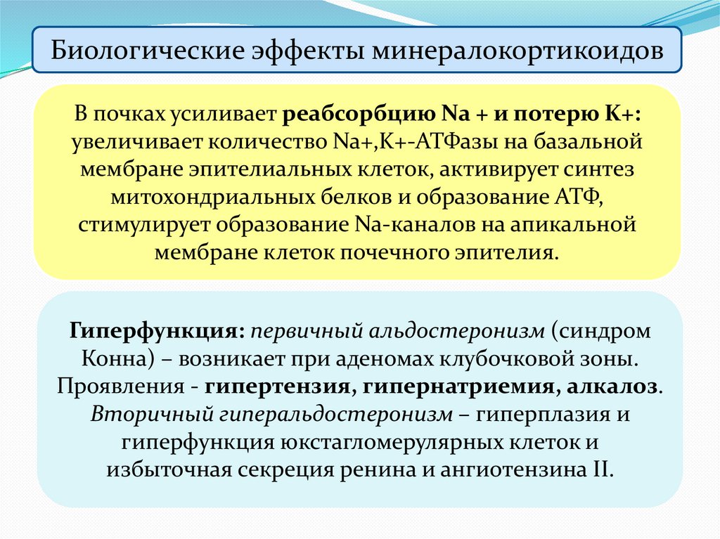 Биологические эффекты минералокортикоидовВ почках усиливает реабсорбцию Na + и потерю K+: