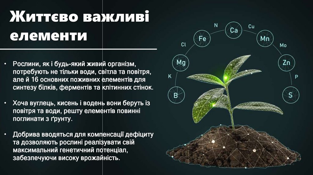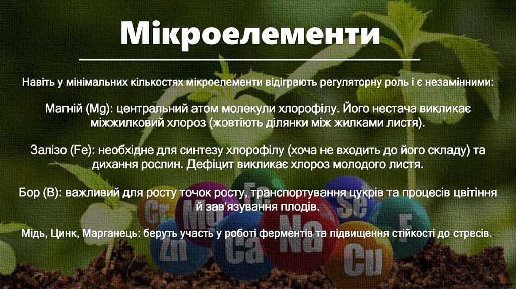 МікроелементиНавіть у мінімальних кількостях мікроелементи відіграють регуляторну роль і є незамінними: