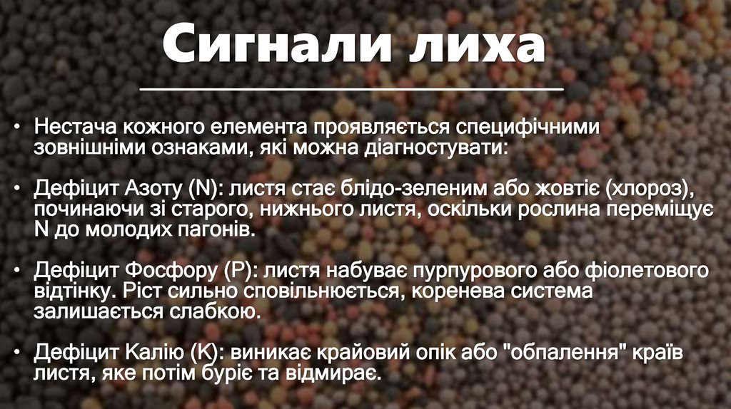 Сигнали лиха• Нестача кожного елемента проявляється специфічними