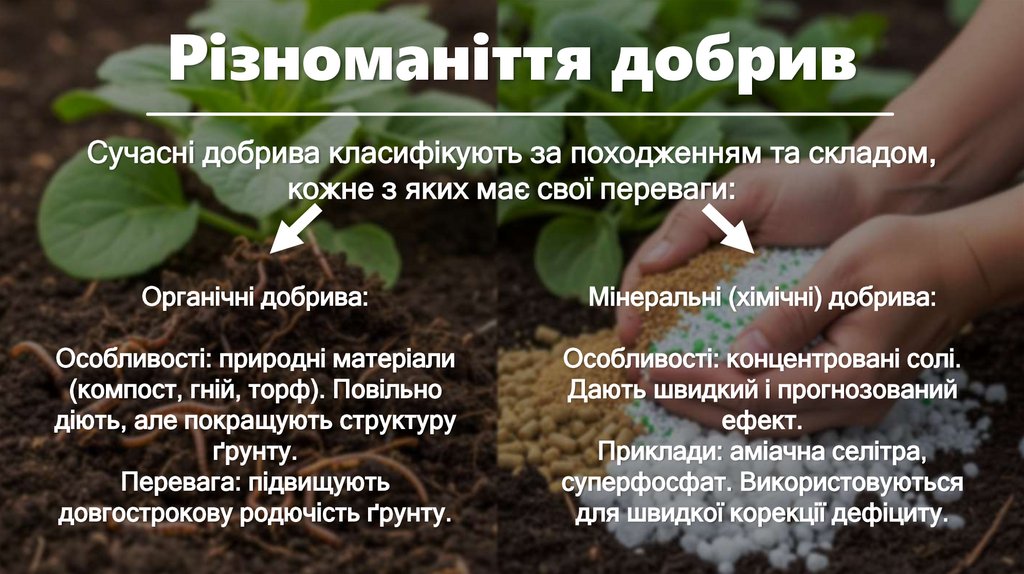 Різноманіття добривСучасні добрива класифікують за походженням та складом,