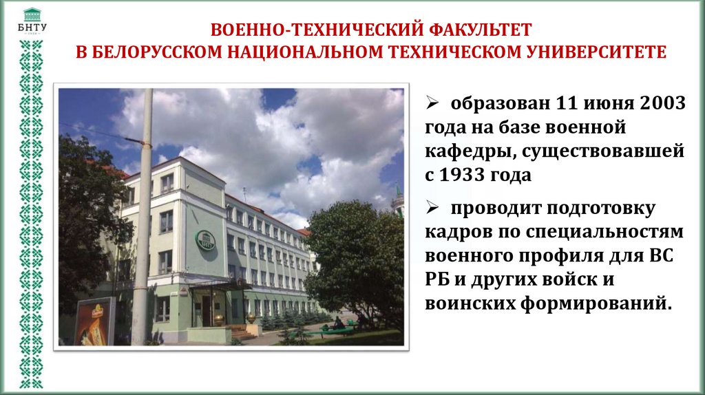 ВОЕННО-ТЕХНИЧЕСКИЙ ФАКУЛЬТЕТВ БЕЛОРУССКОМ НАЦИОНАЛЬНОМ ТЕХНИЧЕСКОМ УНИВЕРСИТЕТЕ