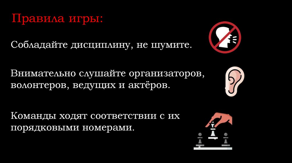 Правила игры:Cобладайте дисциплину, не шумите.