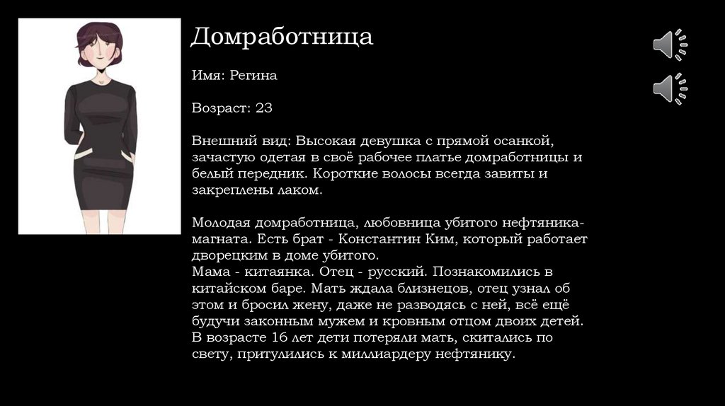Молодая домработница, любовница убитого нефтяникамагната. Есть брат - Константин Ким, который работает