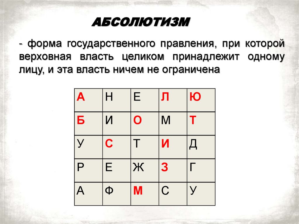 АБСОЛЮТИЗМ- форма государственного правления, при которой