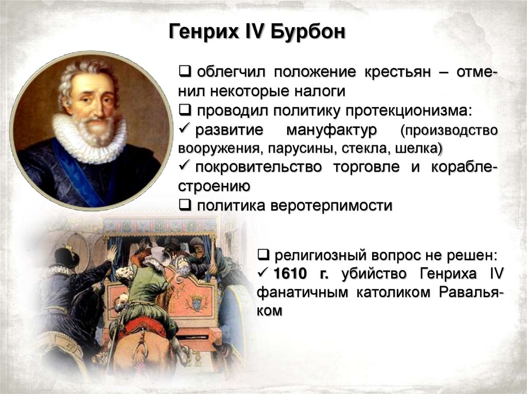 Генрих IV Бурбоноблегчил положение крестьян – отменил некоторые налоги