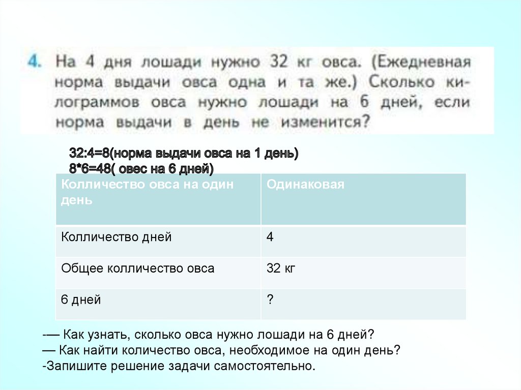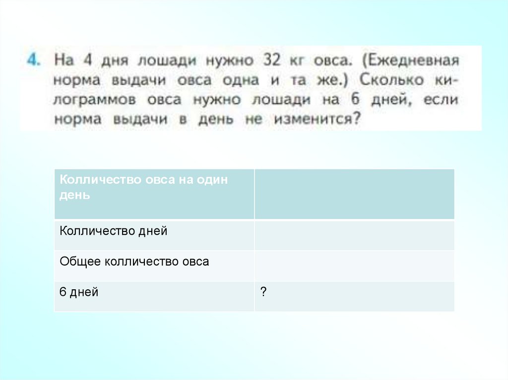 -— Как узнать, сколько овса нужно лошади на 6 дней?