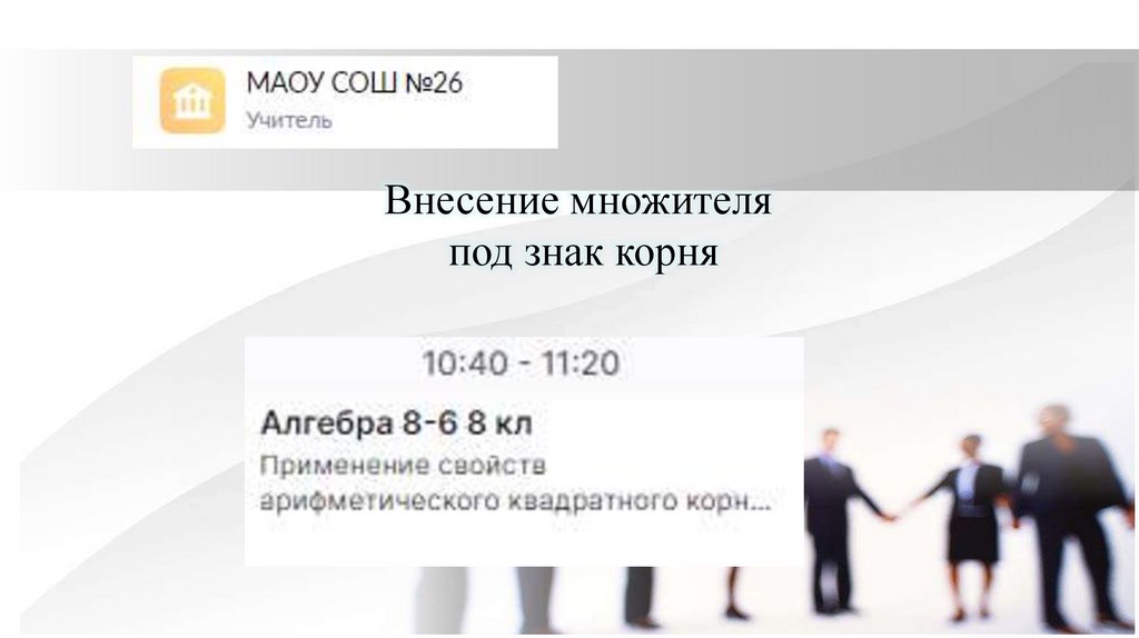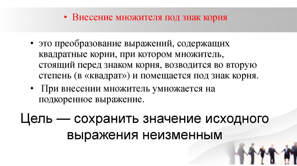 • Внесение множителя под знак корня• это преобразование выражений, содержащих
