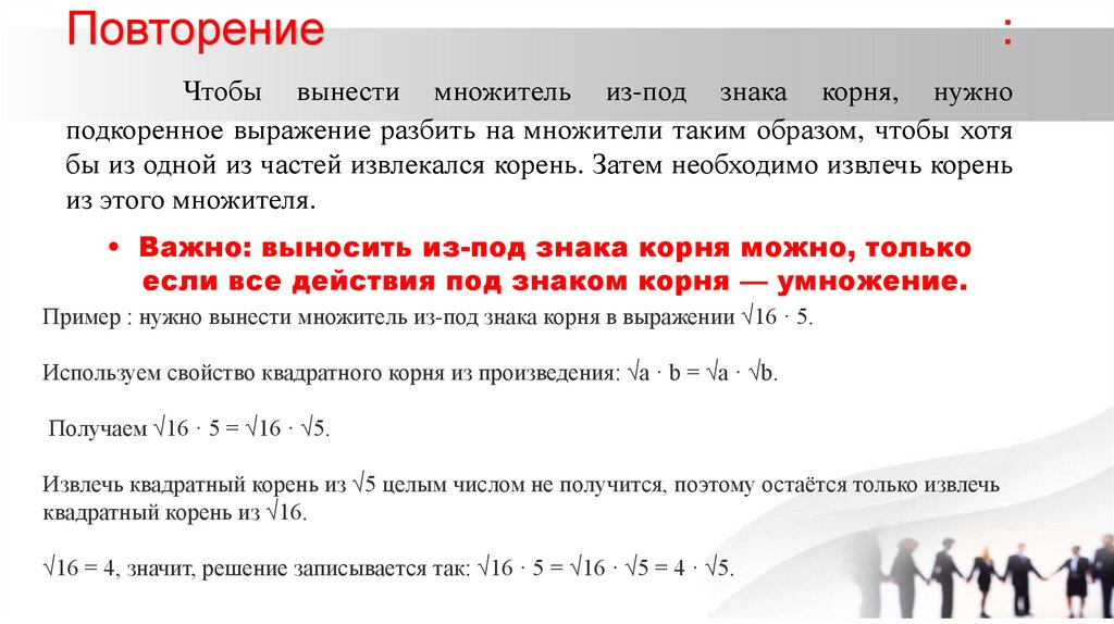 • Важно: выносить из-под знака корня можно, только