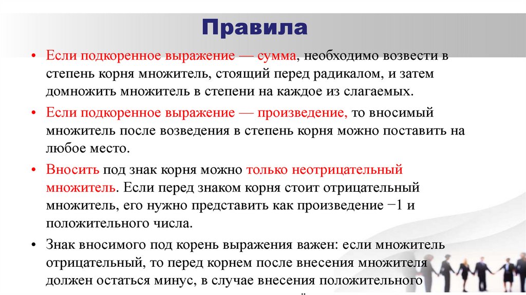 отрицательный, то перед корнем после внесения множителя