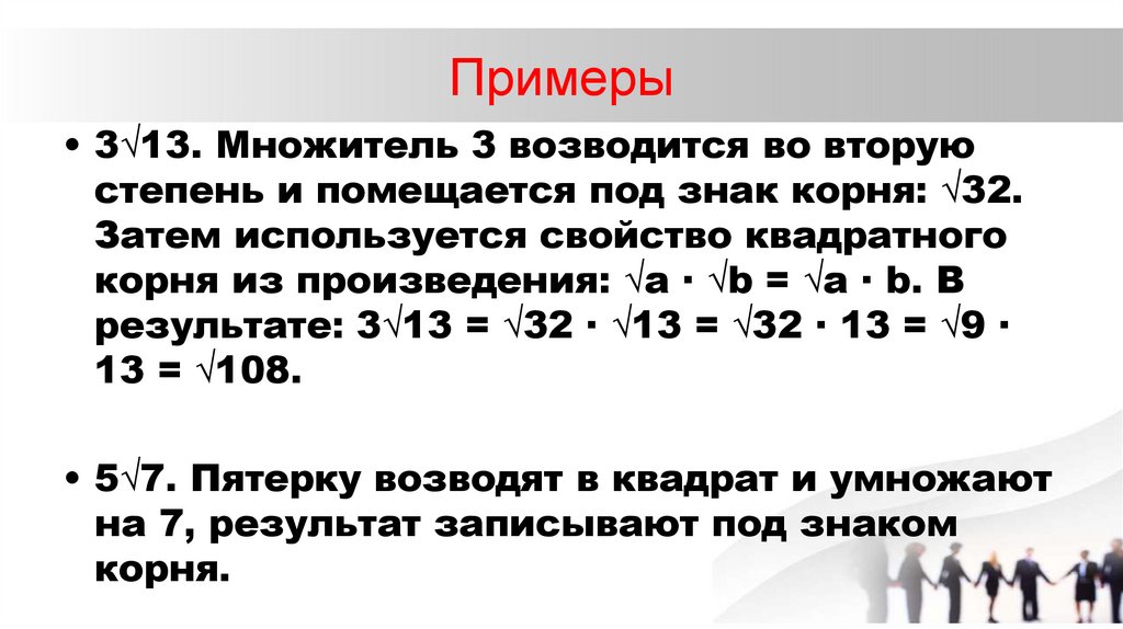 Примеры• 3√13. Множитель 3 возводится во вторую