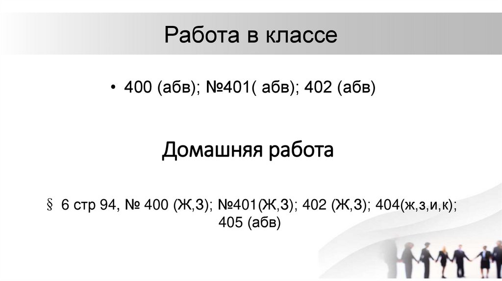 Работа в классе• 400 (абв); №401( абв); 402 (абв)