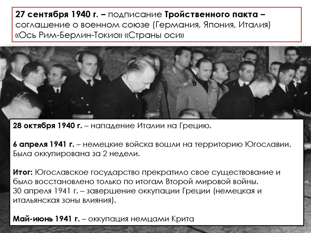 27 сентября 1940 г. – подписание Тройственного пакта –соглашение о военном союзе (Германия, Япония, Италия)