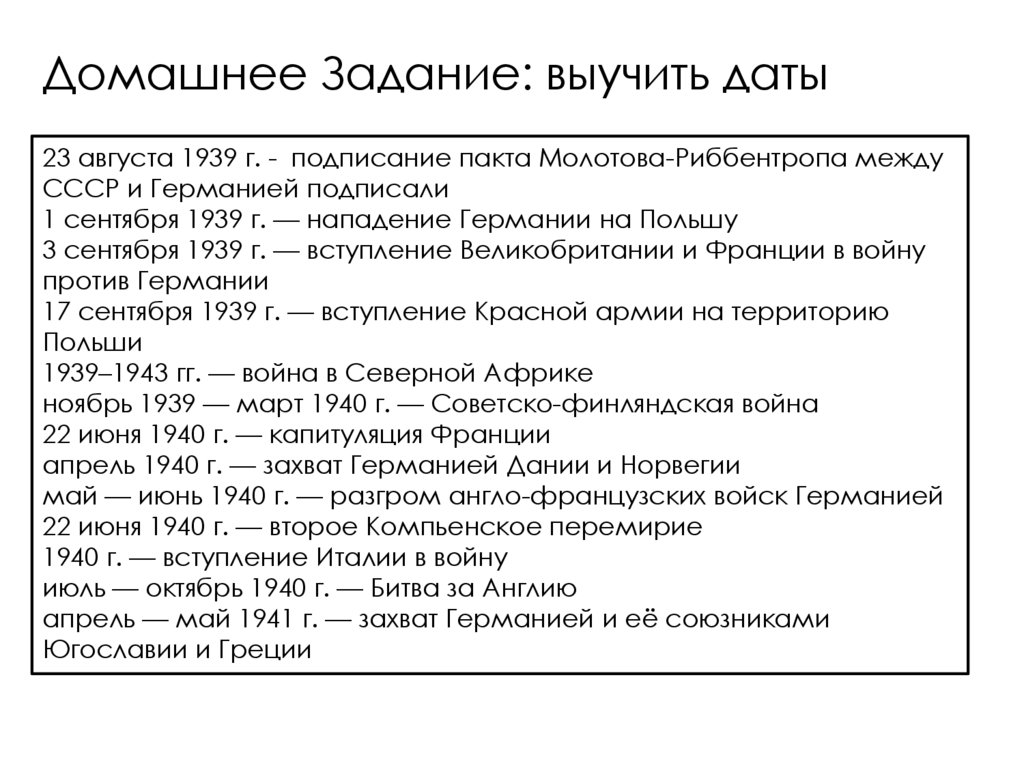 Домашнее Задание: выучить даты23 августа 1939 г. - подписание пакта Молотова-Риббентропа между