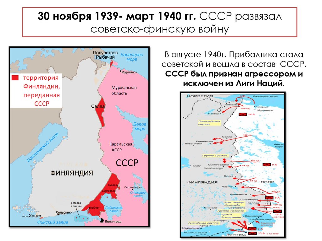 30 ноября 1939- март 1940 гг. СССР развязалсоветско-финскую войну