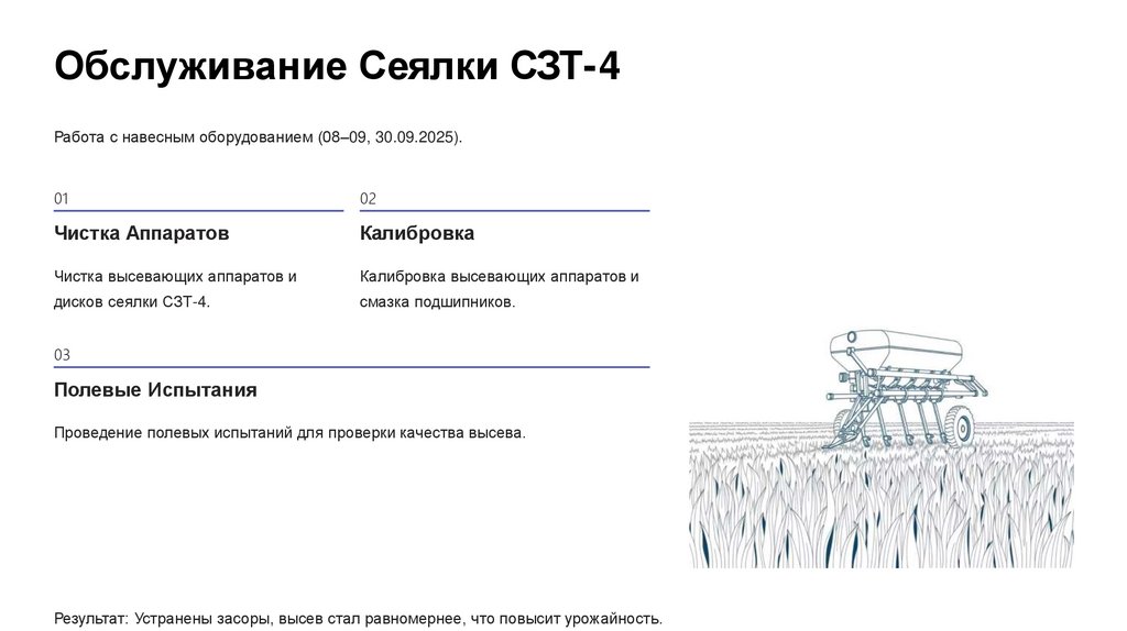 Обслуживание Сеялки СЗТ-4Работа с навесным оборудованием (08–09, 30.09.2025).