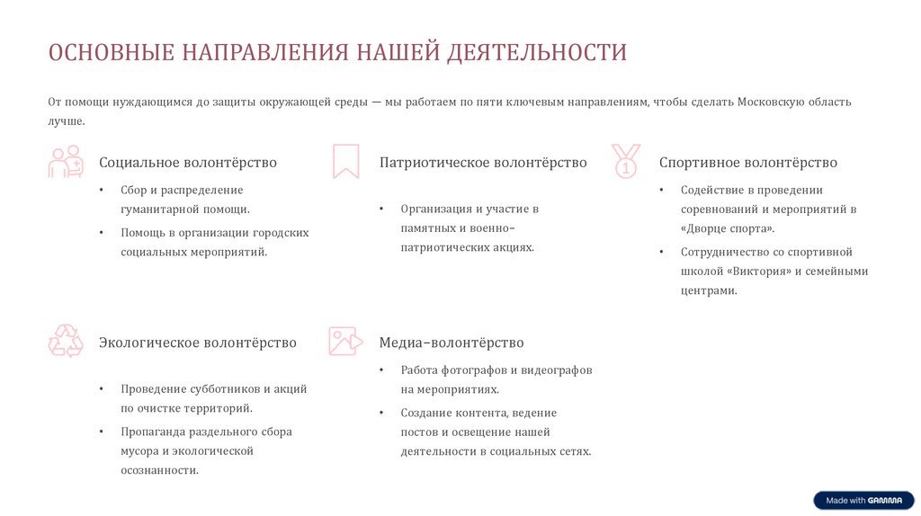 ОСНОВНЫЕ НАПРАВЛЕНИЯ НАШЕЙ ДЕЯТЕЛЬНОСТИОт помощи нуждающимся до защиты окружающей среды — мы работаем по пяти ключевым направлениям, чтобы сделать Московскую область